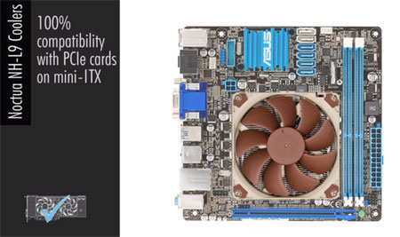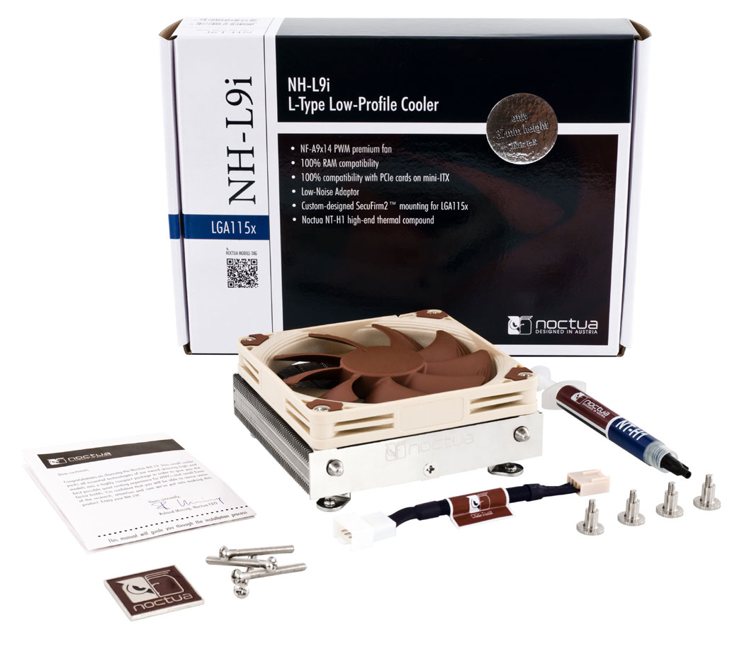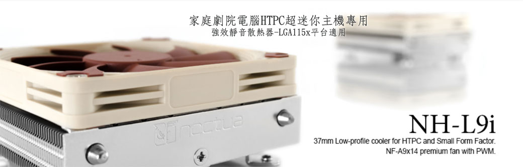 NH-L9i 的設計是為了在家庭劇院電腦 HTPC 或安裝在空間受嚴重限縮的小機箱內,追求卓越靜音之用。 此散熱器本體加上風扇總高度僅只有37mm,置於在95x95mm空間內,與記憶體模組及Mini-ITX主機板有良好相容性。特別設計的SecuFirm2™安裝扣具系統方便使用在LGA115x平台上使用,NH-L9i內建高度優化的NF-A9x14超值風扇,完全支援PWM轉速控制,運行起來非常安靜。並配有Noctua相當有名NT-H1散熱膏,NH-L9i等於是將較大的散熱器融合轉變成為一個超小型散熱器可以在超薄HTPC系統中完美運行。