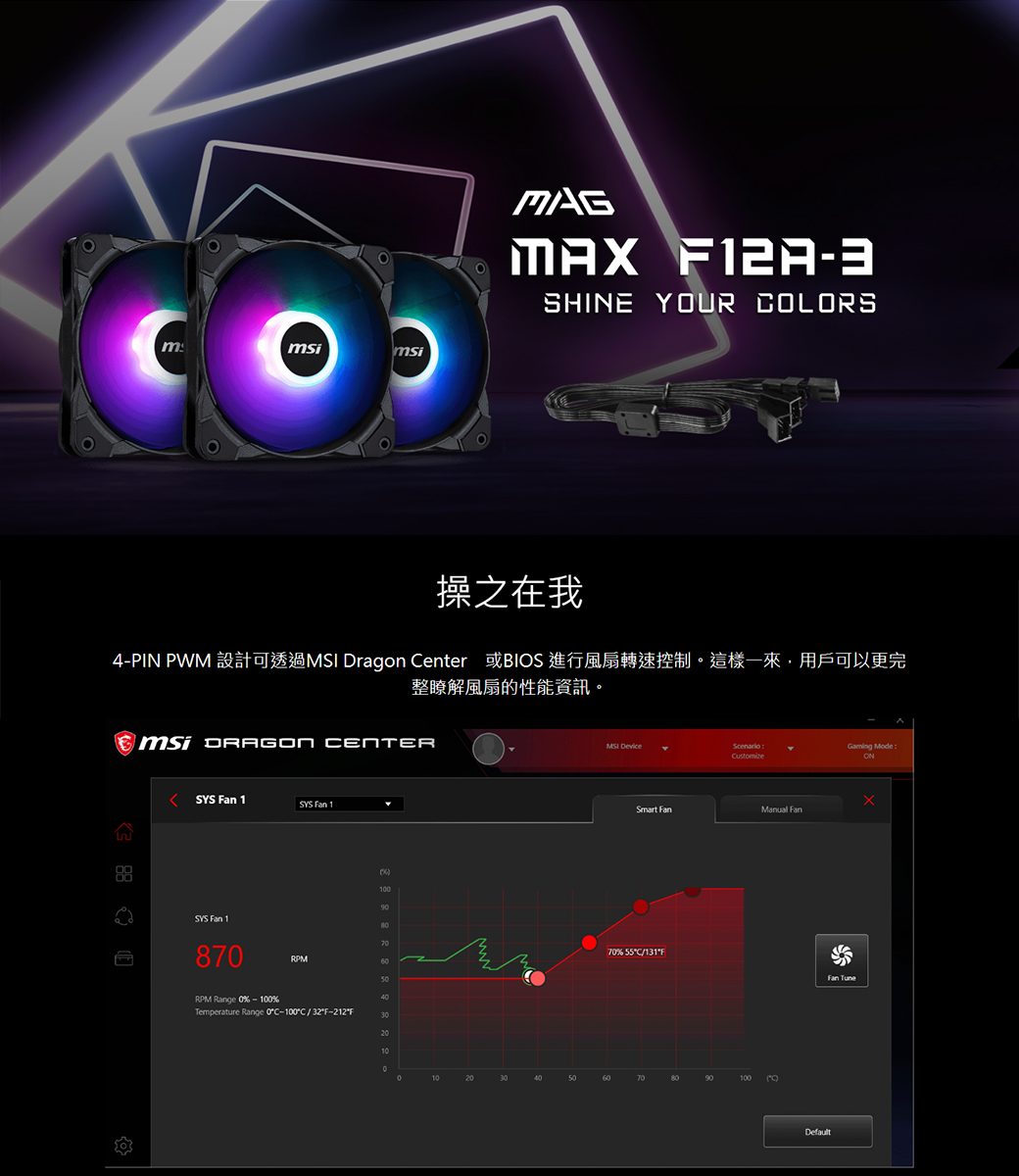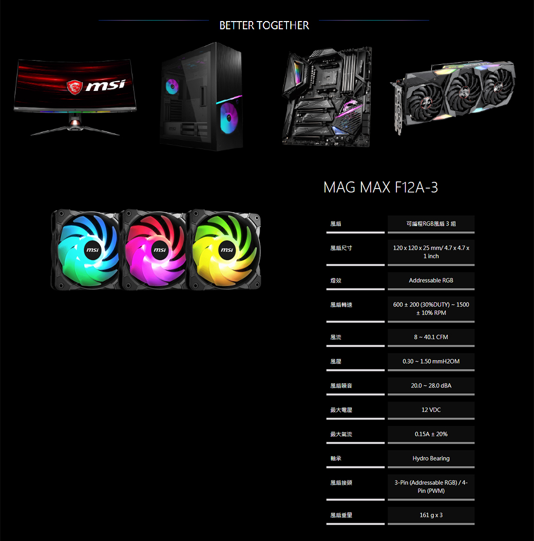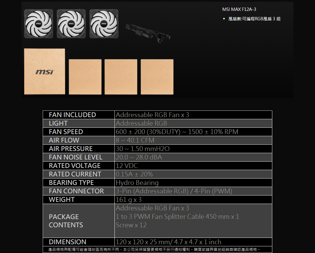 • MSI MAX F12A-3 彩虹風扇 12cm(三入裝)
