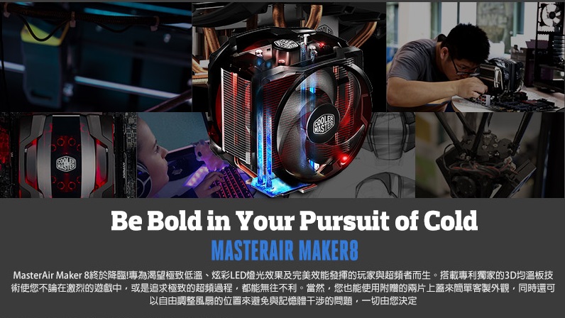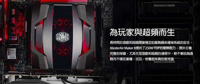 品名: Masterair Maker 8 CPU散熱器 型號: MAZ-T8PN418PR-R1 相容性: Intel® LGA 2011-3 / 2011 / 1366 / 1156 / 1155 / 1151 / 1150 / 775 AMD FM2+ / FM2 / FM1 / AM3+ / AM3 / AM2+ 熱導管: 8支 尺寸: 135 x 145 x 172 mm (L、W、H) 散熱器尺寸: 78 x 144.5 x 160.5 mm (L、W、H) 散熱器重量: 758g 熱導管尺寸: Φ6 mm 風扇尺寸: Φ140x25 mm x2 pcs 風扇轉速: 600-1800 RPM±10% 風流: 19.8-66 CFM±10% 風扇空壓: 0.24-2.2 mmH2O 風扇壽命: 160,000 hours 噪音分貝: 8-24 dBA 軸承類型: LDB 液態軸承 風扇連接頭: 4 Pin 額定電壓: 12VDC 額定電流: 0.15A 耗電量: 1.8W 風扇重量: 130g 總重量: 1350g