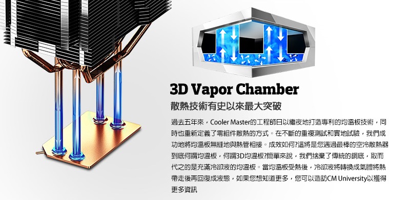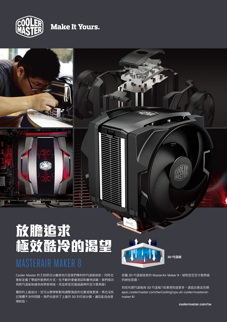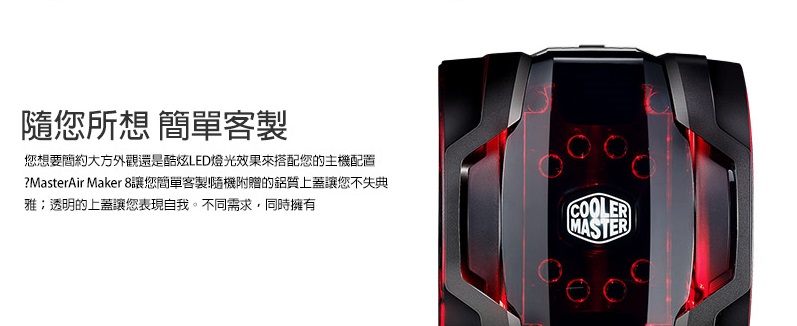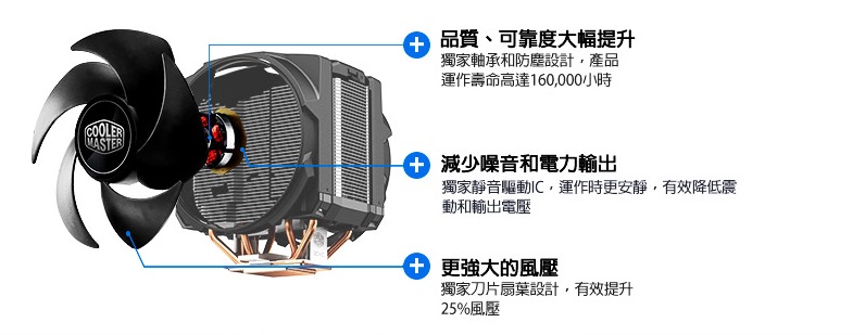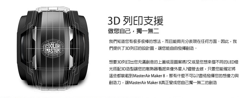 1、直覺式風扇支架設計,讓您升級或調整風扇更得心應手 2、3D列印支援,透過3D列印,您也可以當創客,打造屬於您自己獨一無二的上蓋 3、3D立體均溫板技術,無縫技術接合3D均溫板、銅底和熱管,與傳統散熱器相比,有效提升19%散熱效果 4、客製化,透過隨附的上蓋,您可以展示炫麗的LED燈光效果,或是使用鋁製的上蓋,讓您的系統更簡約大器 5、可靠且安靜的風扇,搭載Cooler Master獨家高風壓靜音風扇Silencio FP,更長的產品壽命讓您系統散熱更安心