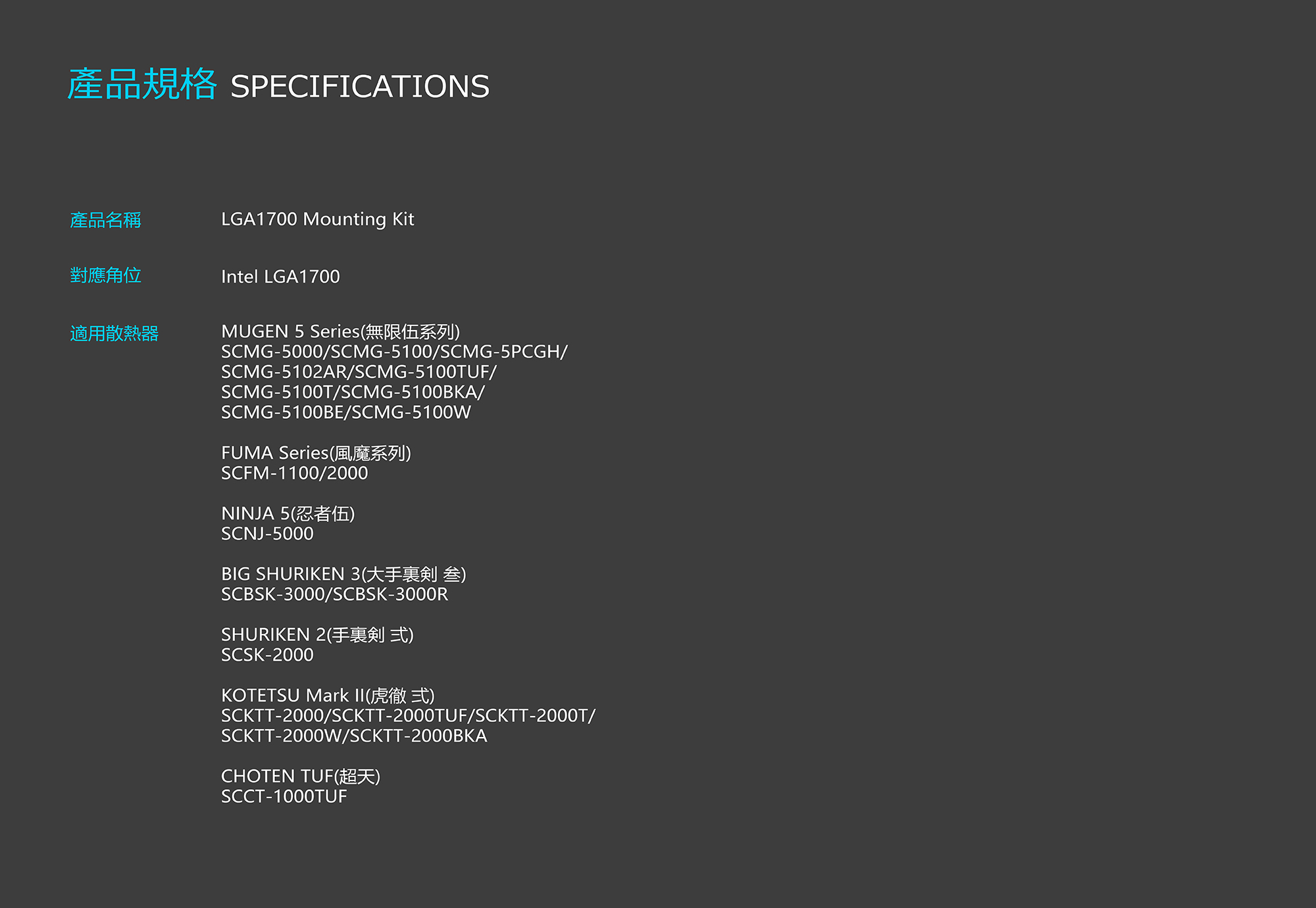 Scythe LGA1700 升級套件(支援 無限伍 /風魔 /忍者伍 /大手裏劍3 /手裏劍2 /虎徹II /超天)