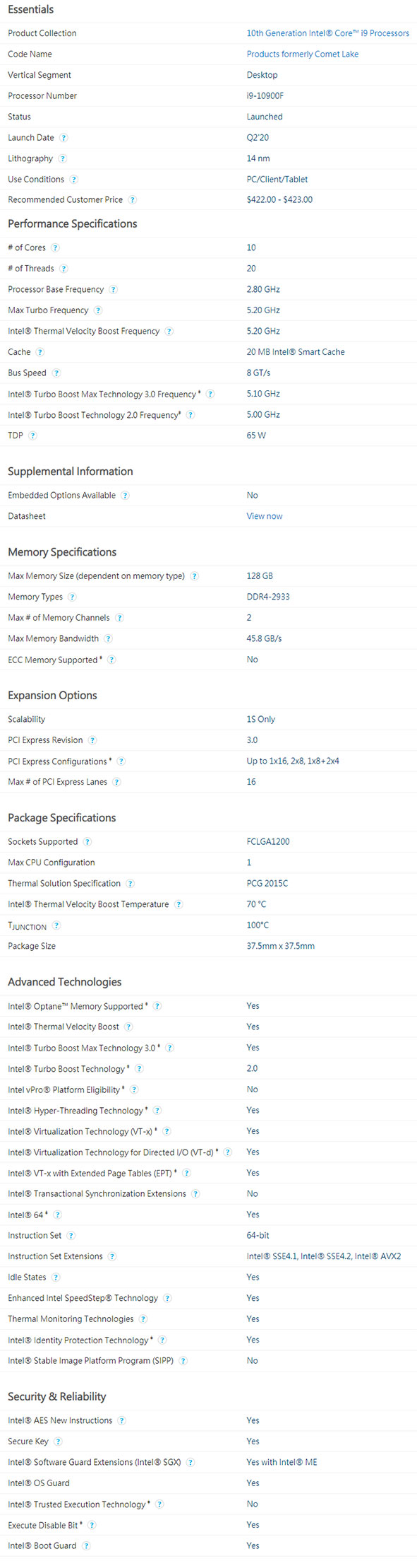 Intel i9-10900F【10核/20緒】2.8GHz(↑5.2GHz)/20M/無內顯/65W【代理盒】