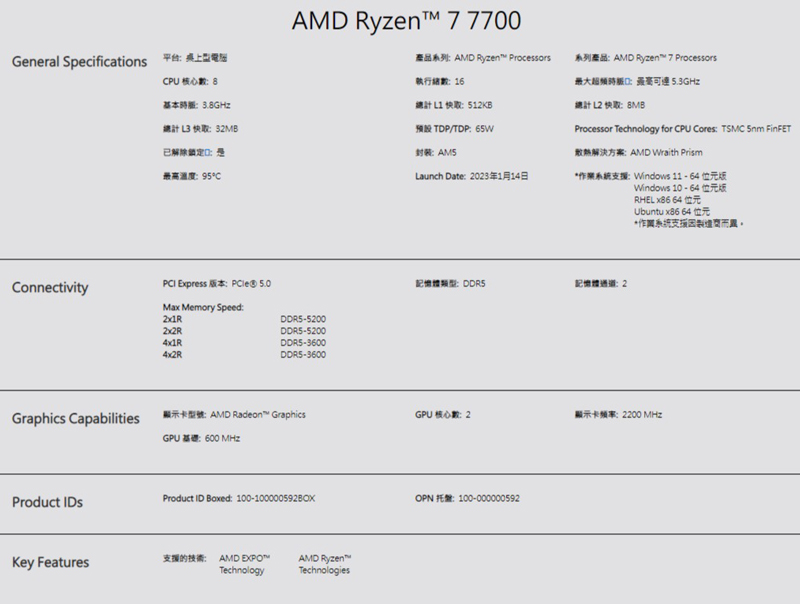 AMD R7 7700【8核/16緒】3.8G(↑5.3G)65W/32M/5nm RDNA2內顯/PCIe5.0 含風扇