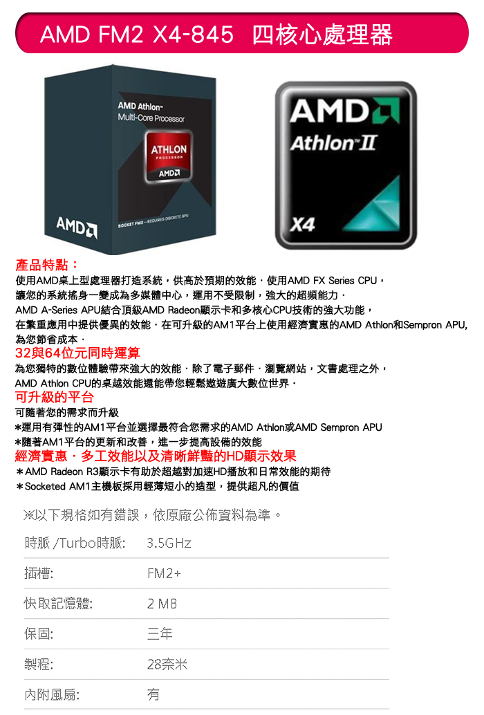 AMD X4-845 四核心處理器 3.5GHz(↑3.8GHz)/無內顯/65W/2M快取/2
