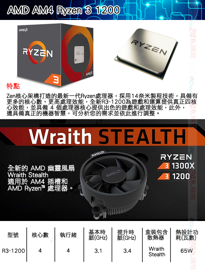 AMD R3 1200【四核】3.1G(↑3.4G)65W/8M/14nm/無內顯