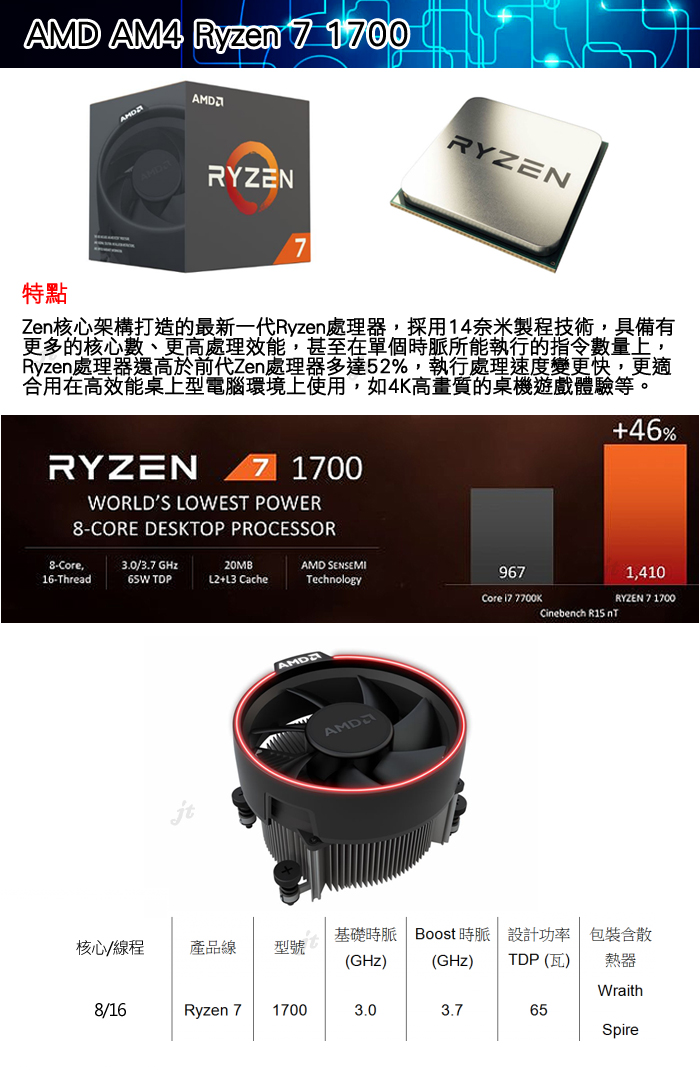 • AMD R7 1700【八核】3.0G(↑3.7G)65W/20M/14nm