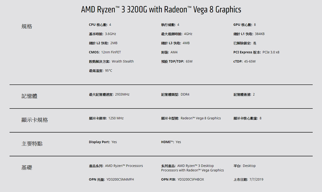 AMD R3 3200G【4核/4緒】3.6G(↑4.0G)65W/4M/12nm/Vega 8內顯