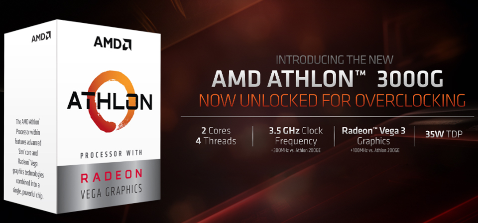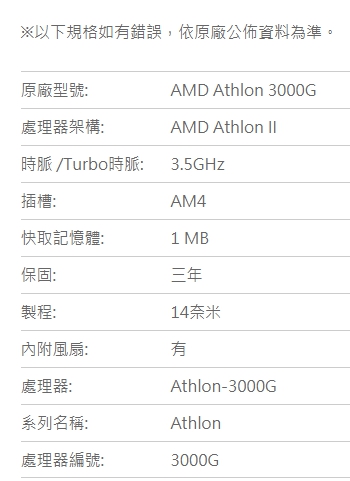 【搭機價】 AMD Athlon 3000G【2核/4緒】3.5GHz/35W/5M/14nm/Vega 3內顯/含風扇