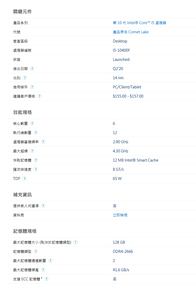 【限搭機】Intel i5-10400F【6核/12緒】2.9GHz(↑4.3GHz)/12M/無內顯/65W【平輸國際保】