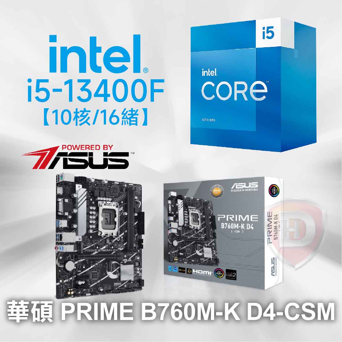 Intel i5-13400F【10核/16緒】2.5GHz(↑4.6G)/20M/無內顯/65W【代理盒裝】+華碩 PRIME B760M-K D4-CSM(M-ATX/Realtek 2.5Gb/註冊四年/2DIMM)8相供電