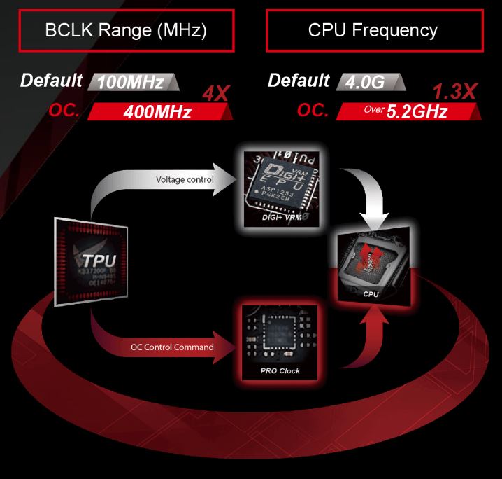 OC 設計 ASUS PRO 時脈技術 您認為目前的超頻已經足夠? 見識 ASUS Pro Clock 吧,專為第六代 Intel® 處理器打造的基礎時脈 (BCLK) 產生器,能提升 BCLK 頻率達 400MHz 或更高。 此自訂方案與 ASUS TurboV 處理單元 (TPU) 聯手增加電壓及基礎時脈超頻控制,以令人耳目一新的方式達到極致效能! ASUS Pro Clock 的優點: ■縮短開機時間 ■在高度超頻的極端環境下,雜訊較低 ■在重度超頻下更加穩定 * BCLK 超頻範圍會依據 CPU 功能、散熱效果、主機板支援及調校選項不同而異。 在特定情況下,最高可達 650MHz。 |