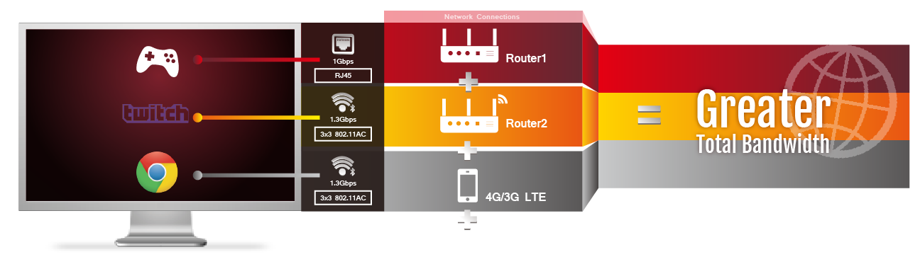 集結所有網路閘道以獲取最大頻寬,並將連線分配到各個應用程式,創造最流暢的遊戲體驗。