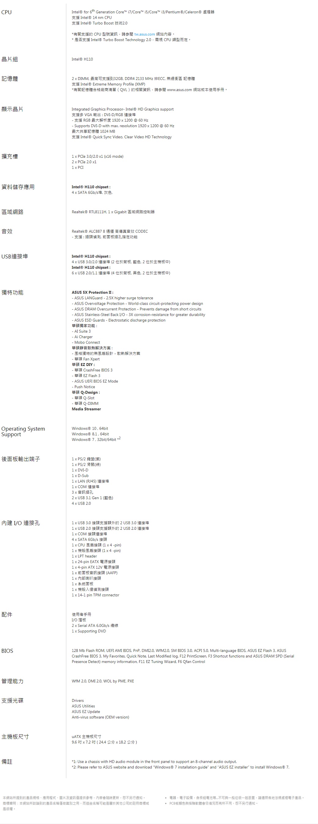 華碩 H110M-C/CSM (M-ATX/1A1D/全固/U3/COM PORT/註四年) 內含ACC軟體