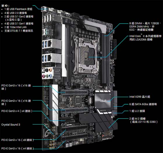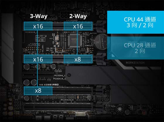 Intel Core X 系列處理器(6 核心以上): 4 通道 (8-DIMM)、44/28 條 PCI Express 3.0/2.0 通道。