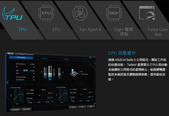 - 5-Way Optimization tuning key perfectly consolidates TPU, EPU, DIGI+ VRM, Fan Expert 4, and Turbo App - TPU