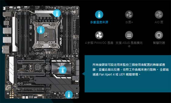 WS X299 PRO 配備史上最全面的散熱控制,可透過 Fan Xpert 4 或 UEFI BIOS 進行設定。
