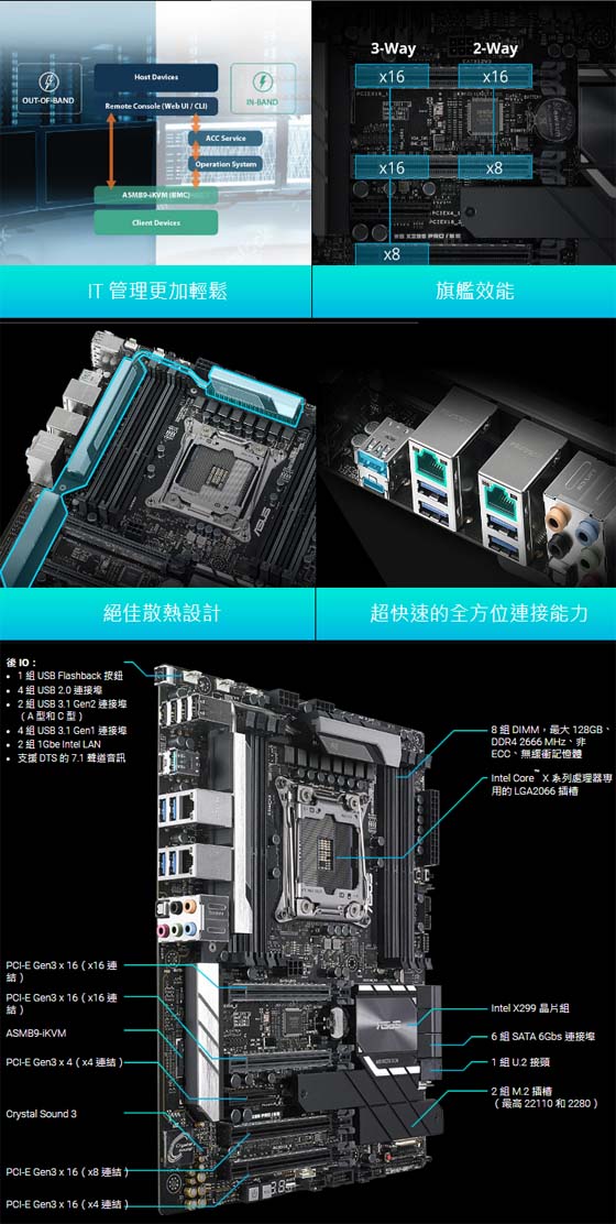 | CPU | Intel® Socket 2066 Core™ X-Series 處理器 *有關支援的 CPU 型號資訊,請參閱 tw.asus.com 網站內容。 |