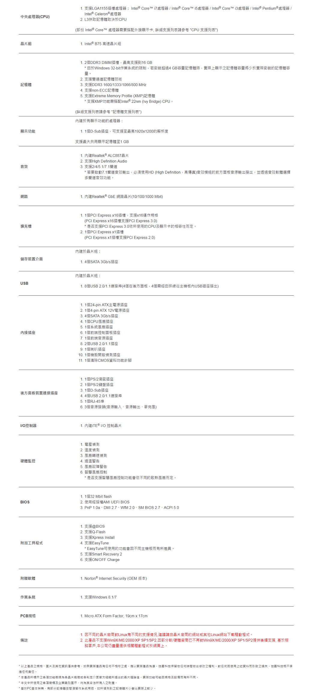 技嘉 B75M-S(M-ATX/1A/2*DDR3/註四年)