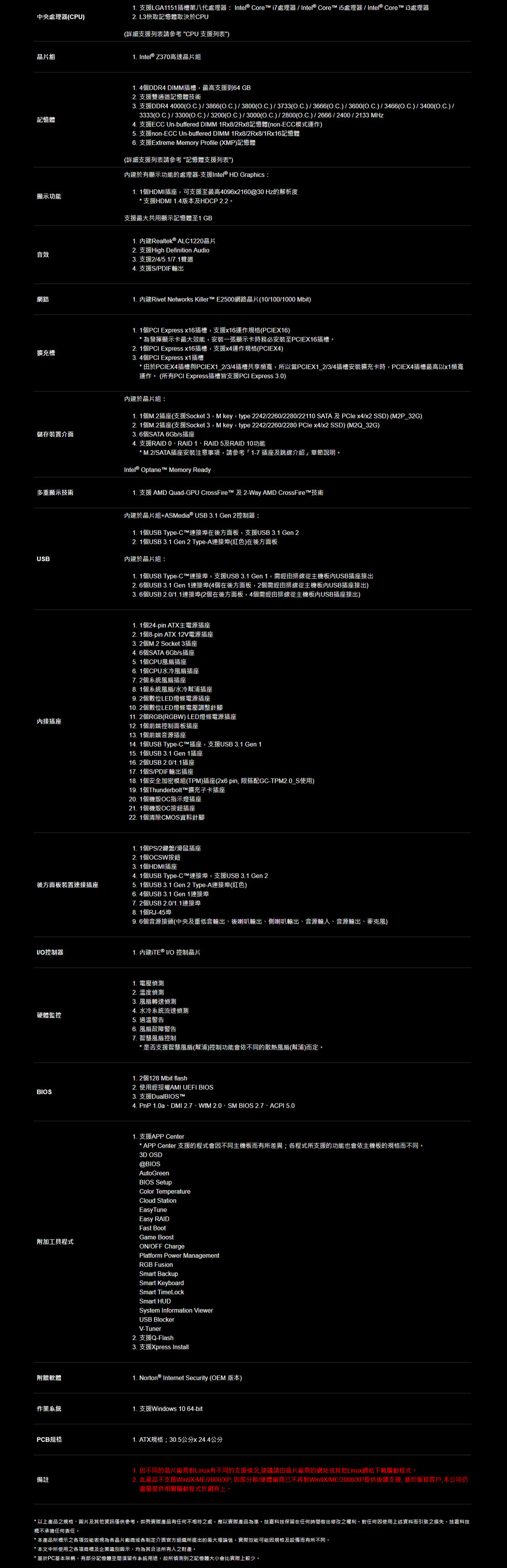 • 技嘉 Z370 AORUS GAMING 3 主機板