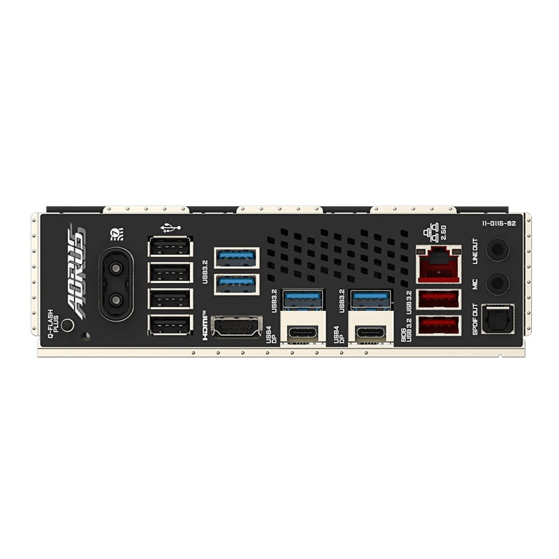 1個Q-Flash Plus按鈕 1個HDMI插座 2個SMA天線連接埠(2T2R) 2個USB4® USB Type-C® (DisplayPort)連接埠 2個USB 3.2 Gen 2 Type-A連接埠(紅色) 4個USB 3.2 Gen 1連接埠 4個USB 2.0/1.1連接埠 1個RJ-45埠 1個S/PDIF光纖輸出插座 2個音源接頭