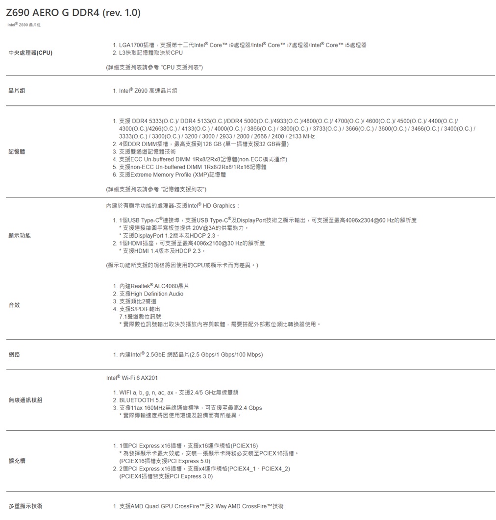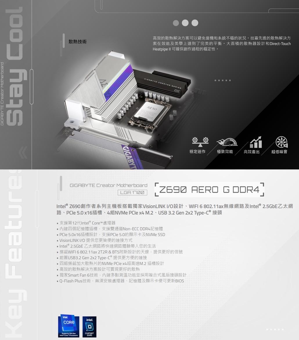 技嘉 Z690 AERO G DDR4(ATX/1H/Intel 2.5G+Wi-Fi 6/註冊五年保)16相電源