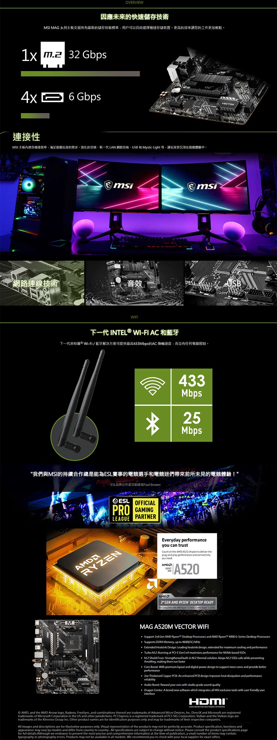 微星 MAG A520M VECTOR WIFI(M-ATX/1D1H/Realtek LAN/註四年)