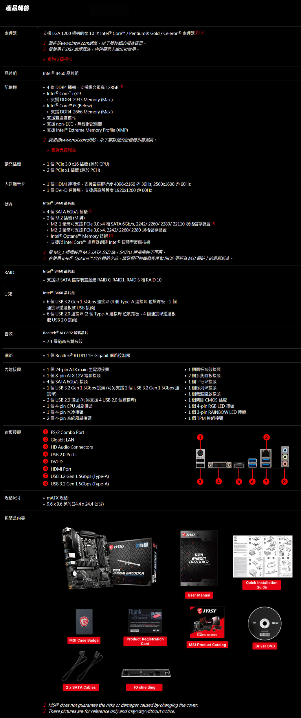 微星 MAG B460M BAZOOKA(1D1H/Realtek LAN/註五年)