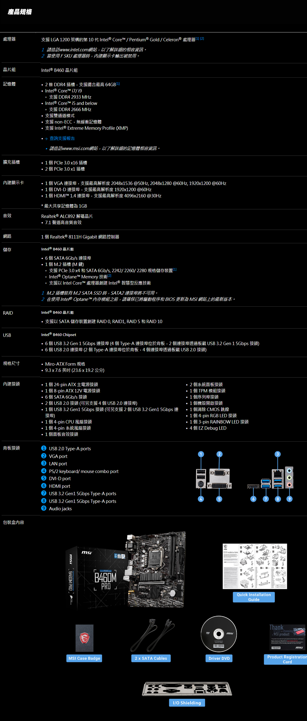 微星 B460M PRO(M-ATX/1A1D1H/Realtek LAN/註四年)