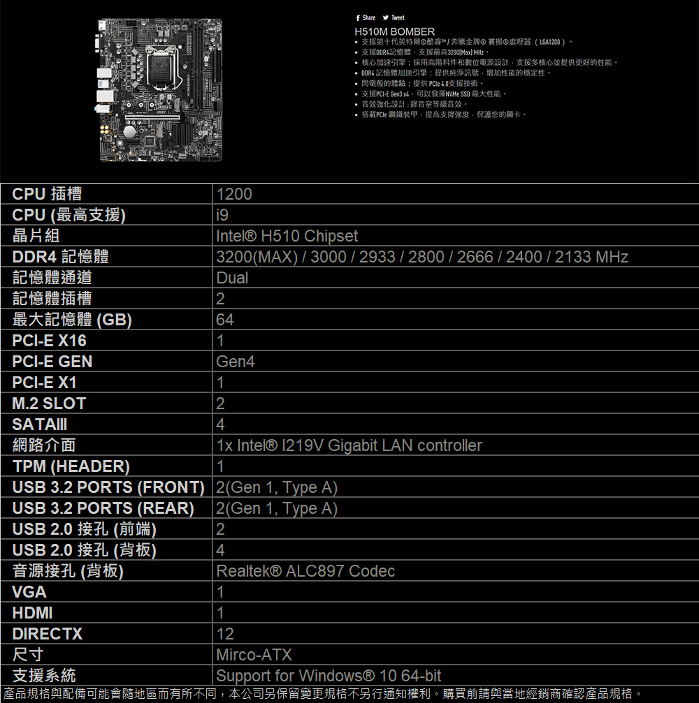 微星 H510M BOMBER(M-ATX/1A1H/Intel 1Gb/註四年) 421相供電
