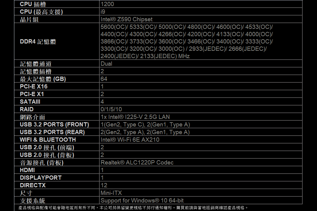 微星 Z590I UNIFY(Mini-ITX/1H1P2T/Intel 2.5G/wifi6EBT5.2/註五