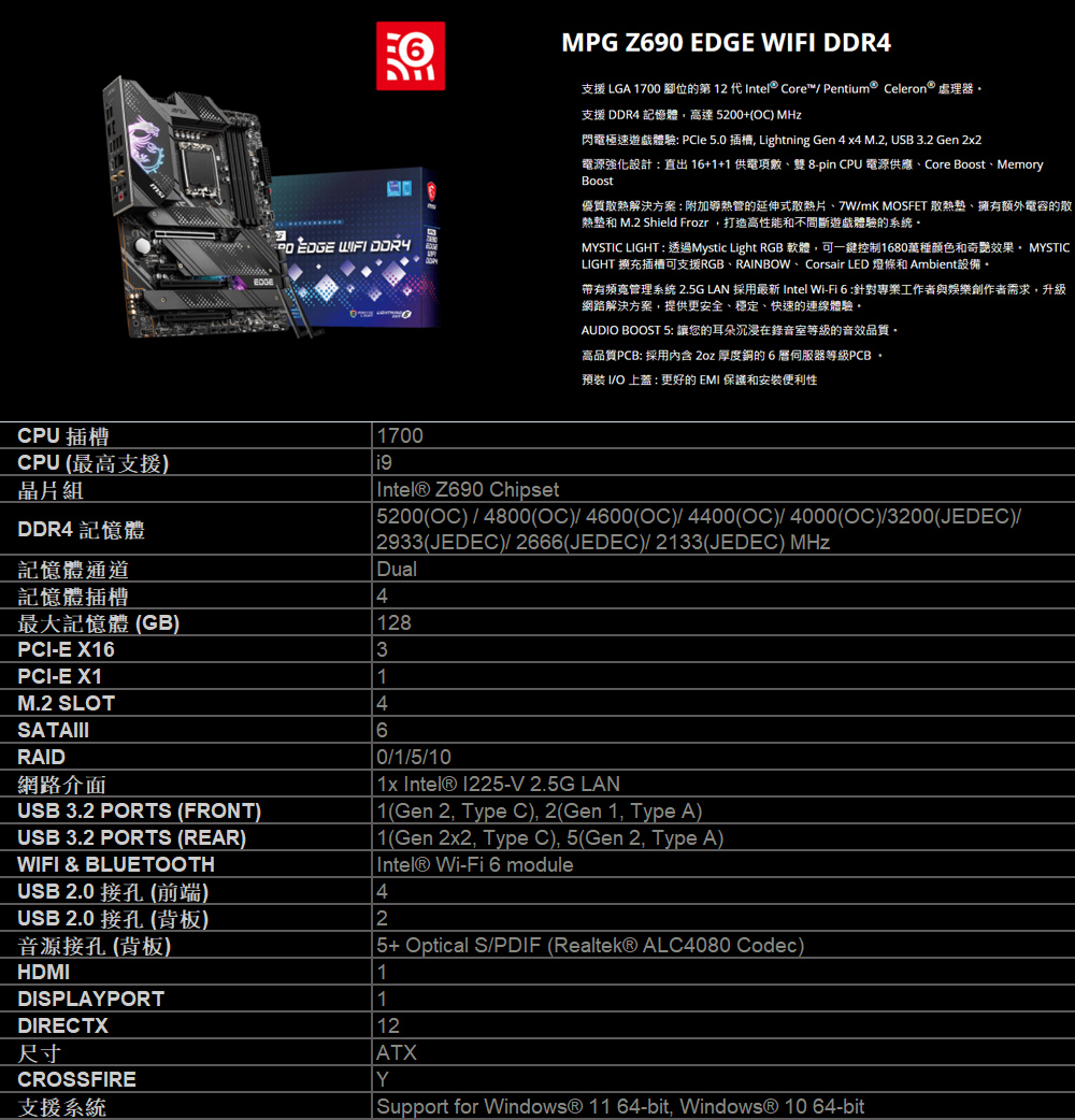 微星 Z690 EDGE WIFI DDR4(ATX/1H1P/Intel 2.5G+Wi-Fi 6/註冊四年)