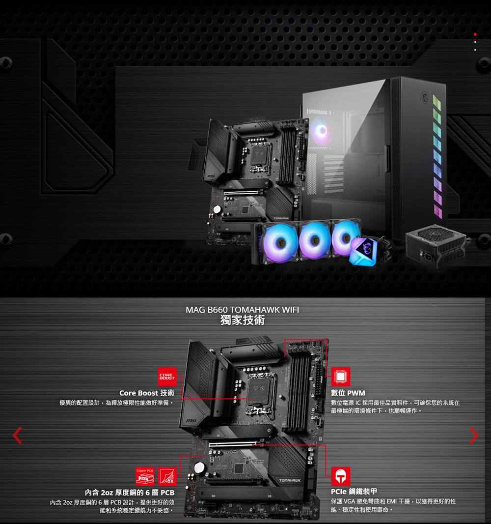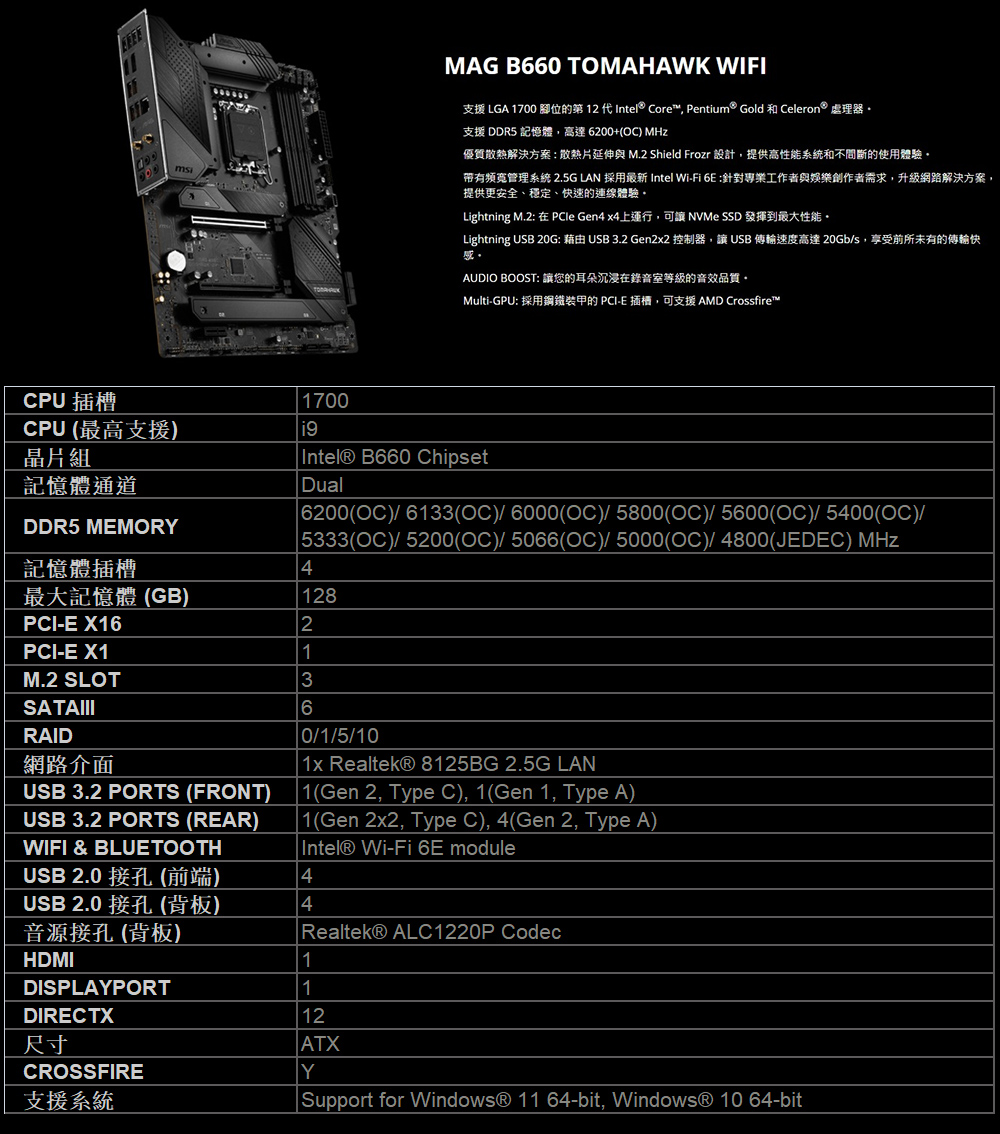 微星 B660 TOMAHAWK WIFI(ATX/1H1P/Realtek 2.5G+Intel WiFi 6E)12+1+1+1相電源