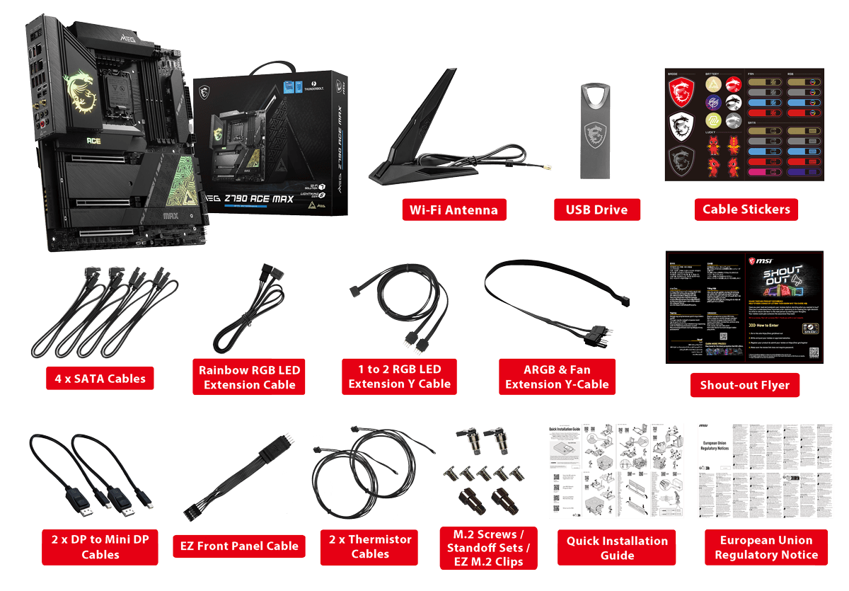 | STORAGE | 5x M.2 (Qty) M.2_1 Source (From CPU) supports up to PCIe 4.0 x4 , supports 22110/2280/2260 devices M.2_2 Source (From Chipset) supports up to PCIe 4.0 x4 , supports 2280/2260 devices M.2_3 Source (From Chipset) supports up to PCIe 4.0 x4 / SATA mode, supports 2280/2260 devices M.2_4 Source (From CPU) supports up to PCIe 5.0 x4 , supports 2280 devices M.2_5 Source (From Chipset) supports up to PCIe 4.0 x4 / SATA mode, supports 22110/2280/2260 devices 6x SATA 6G (Qty) *M2_4 slot will be unavailable when installing in the PCI_E2 slot. **SATA7 will be unavailable when installing M.2 SATA SSD in the M2_5 slot. |