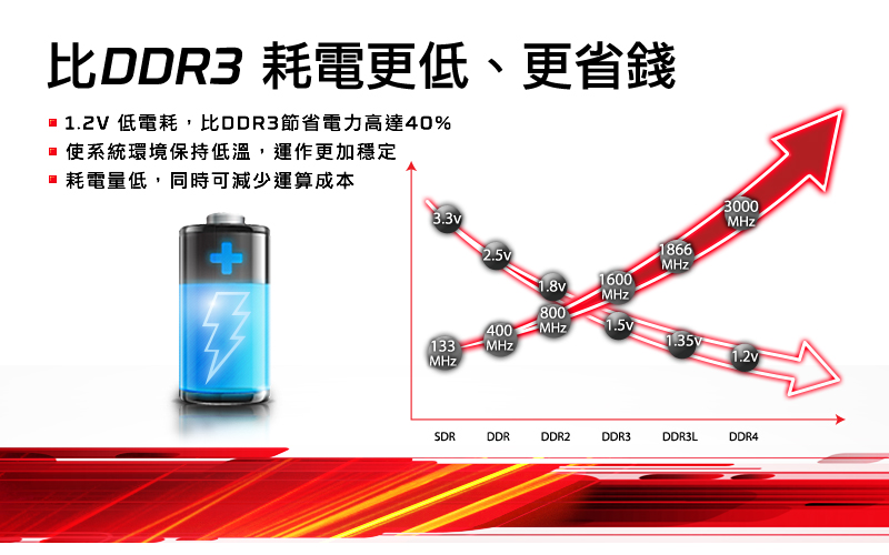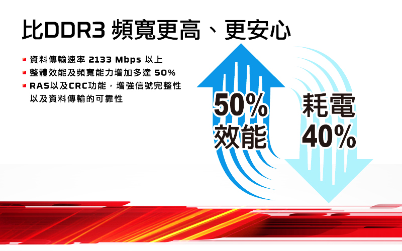 DDR4 能達到每針腳 2Gbps 以上的速率,且耗電量低於 DDR3L (省電型 DDR3);DDR4能降低整體運算環境的電壓,讓效能及頻寬能力增加多達 50%。因此不僅比先前的記憶體技術還要出色許多,而且能節省電力多達約 40%。