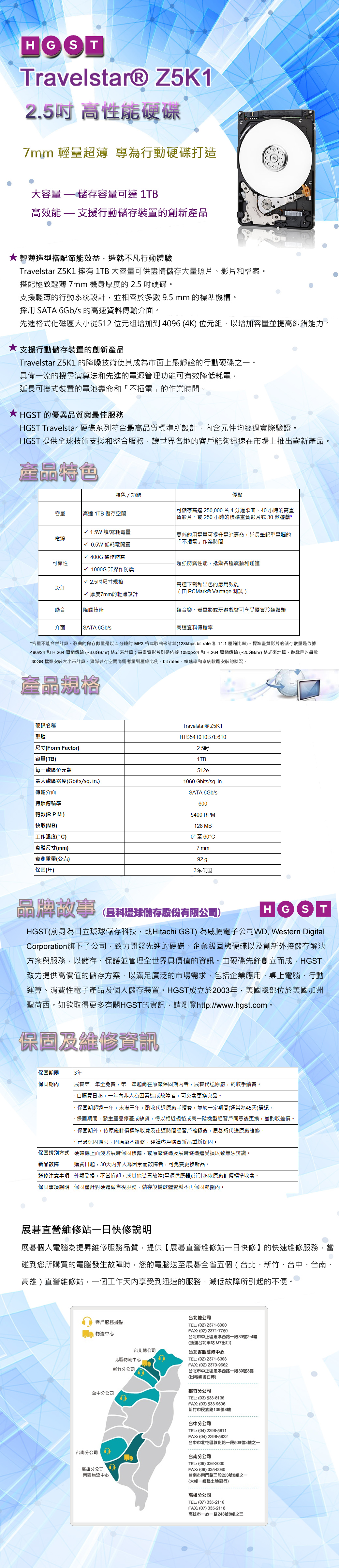 HGST 1TB (HTS541010B7E610)128M【5400轉】7mm/三年保