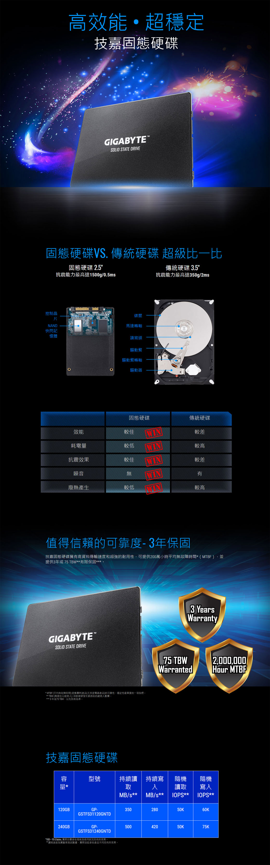 GIGABYTE 技嘉 120GB 7mm/讀:350M/寫:280M/TLC顆粒【三年保】