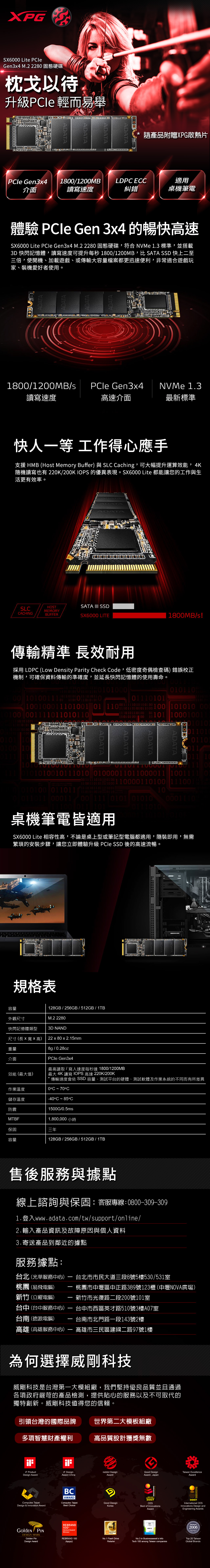 威剛 XPG SX6000 Lite 1TB/M.2 PCIe/讀:1800M/寫:1200M/TLC【三年保】