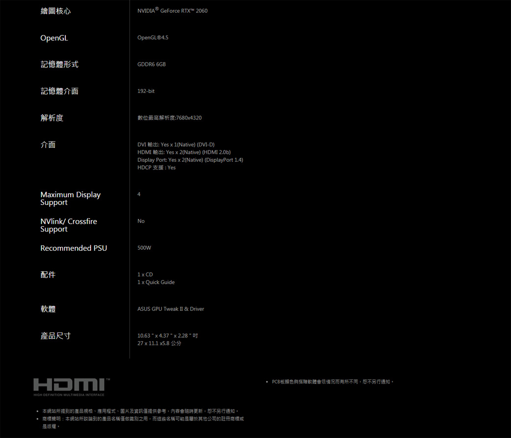 華碩 DUAL-RTX2060-O6G(TBC MHz/27cm/註四年)