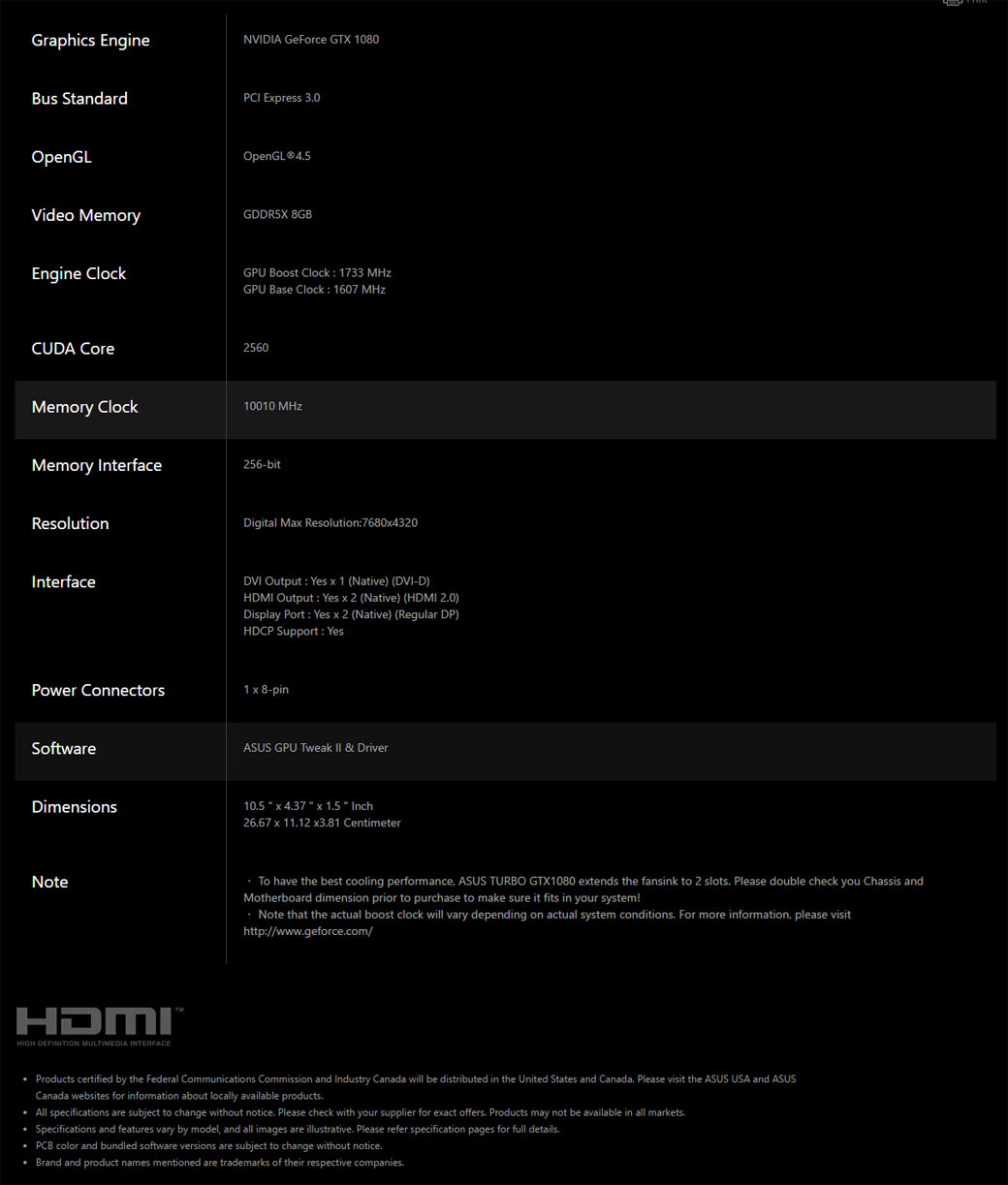 華碩 TURBO-GTX1080-8G(1733MHz/26.7cm/註四年)