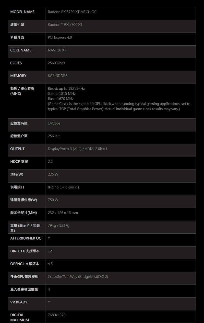 微星 Radeon RX5700 MECH OC 8G(1675MHz/23.2cm/註四年)
