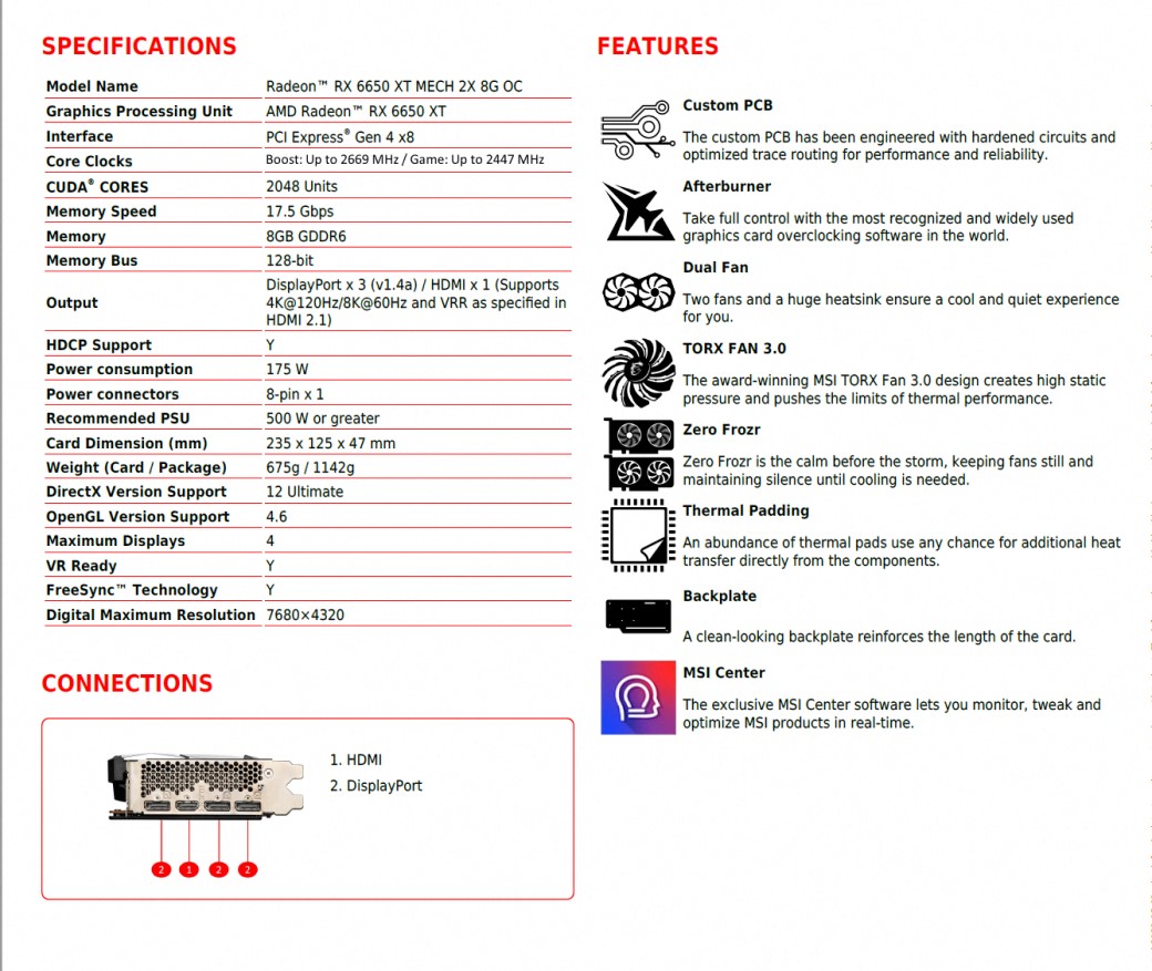 微星 RX6650XT MECH 2X 8G OC(2669MHz/23.5cm/註冊四年/雙風扇)