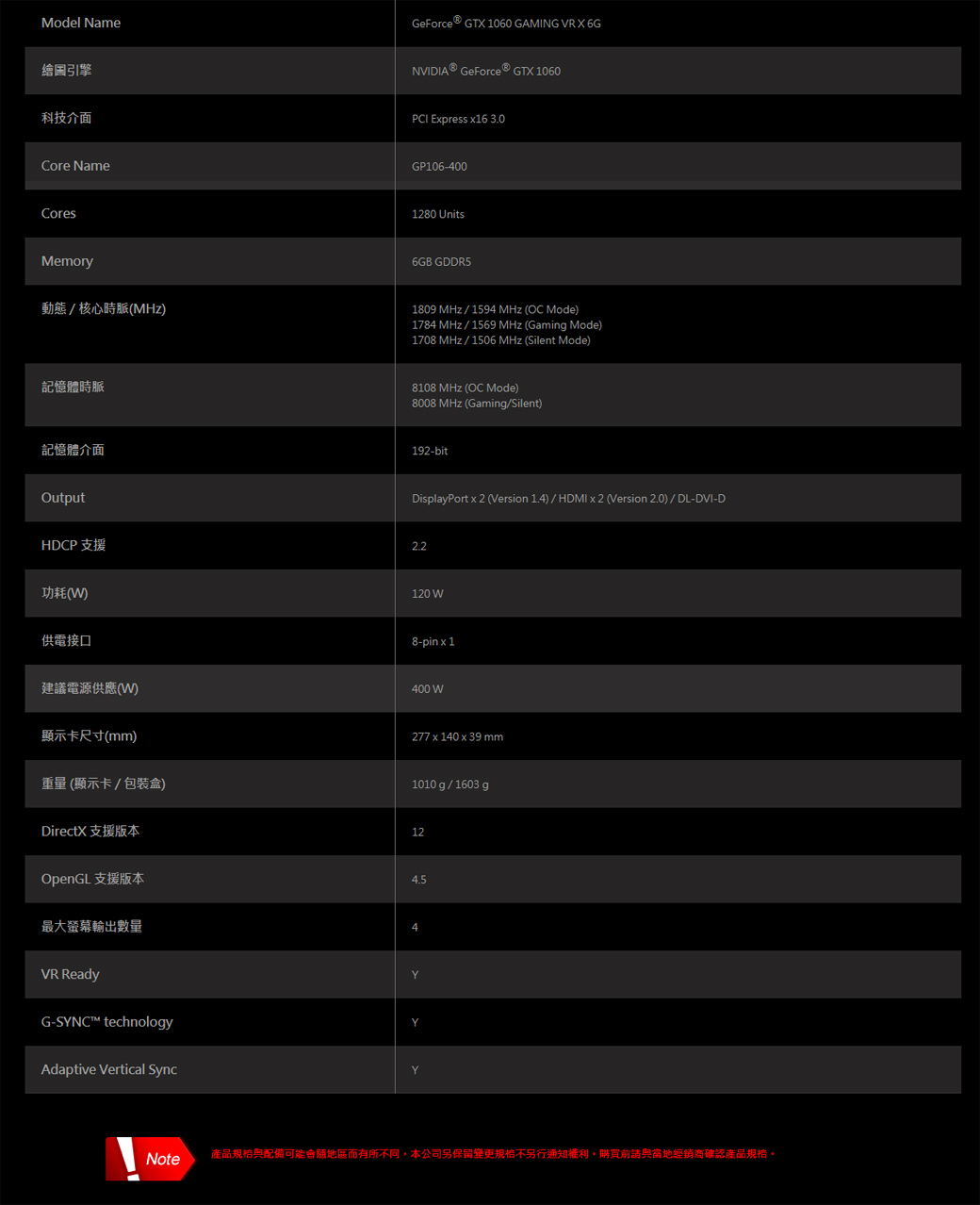 • 微星 GeForce GTX 1060 Gaming VR X 6G 顯示卡