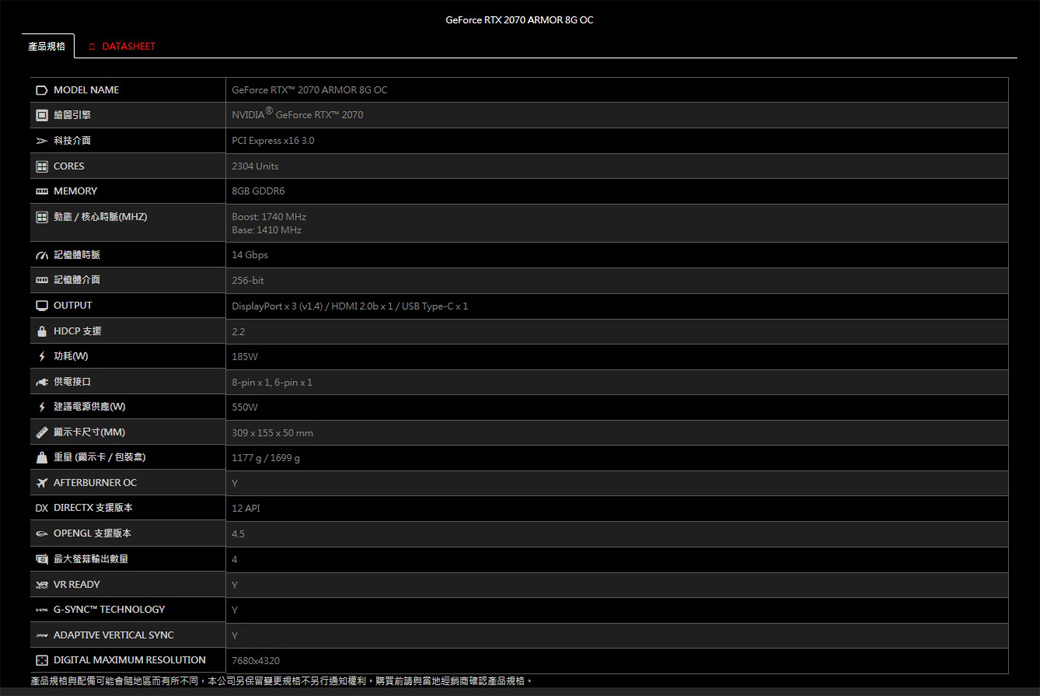 微星 RTX2070 ARMOR 8G OC(1740MHz/30.9cm/註四年)