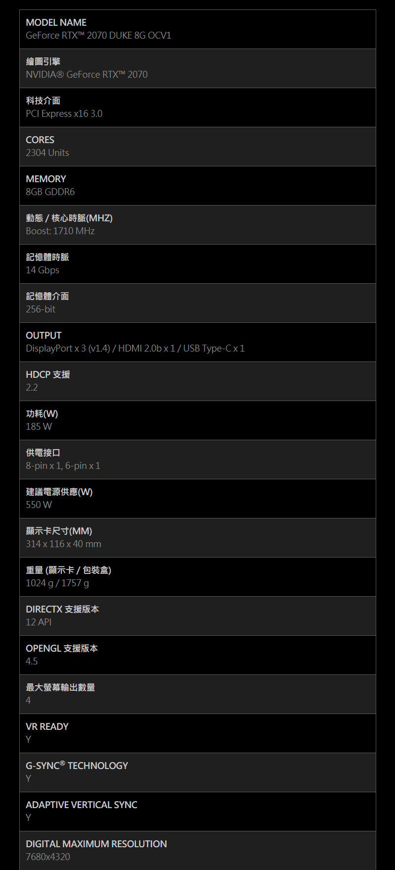 微星 RTX2070 DUKE 8G OCV1(1710MHz/31.4cm/三風扇/註四年)