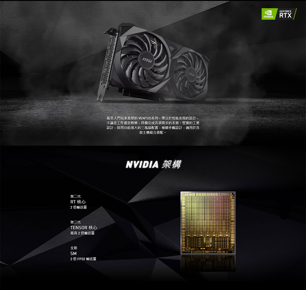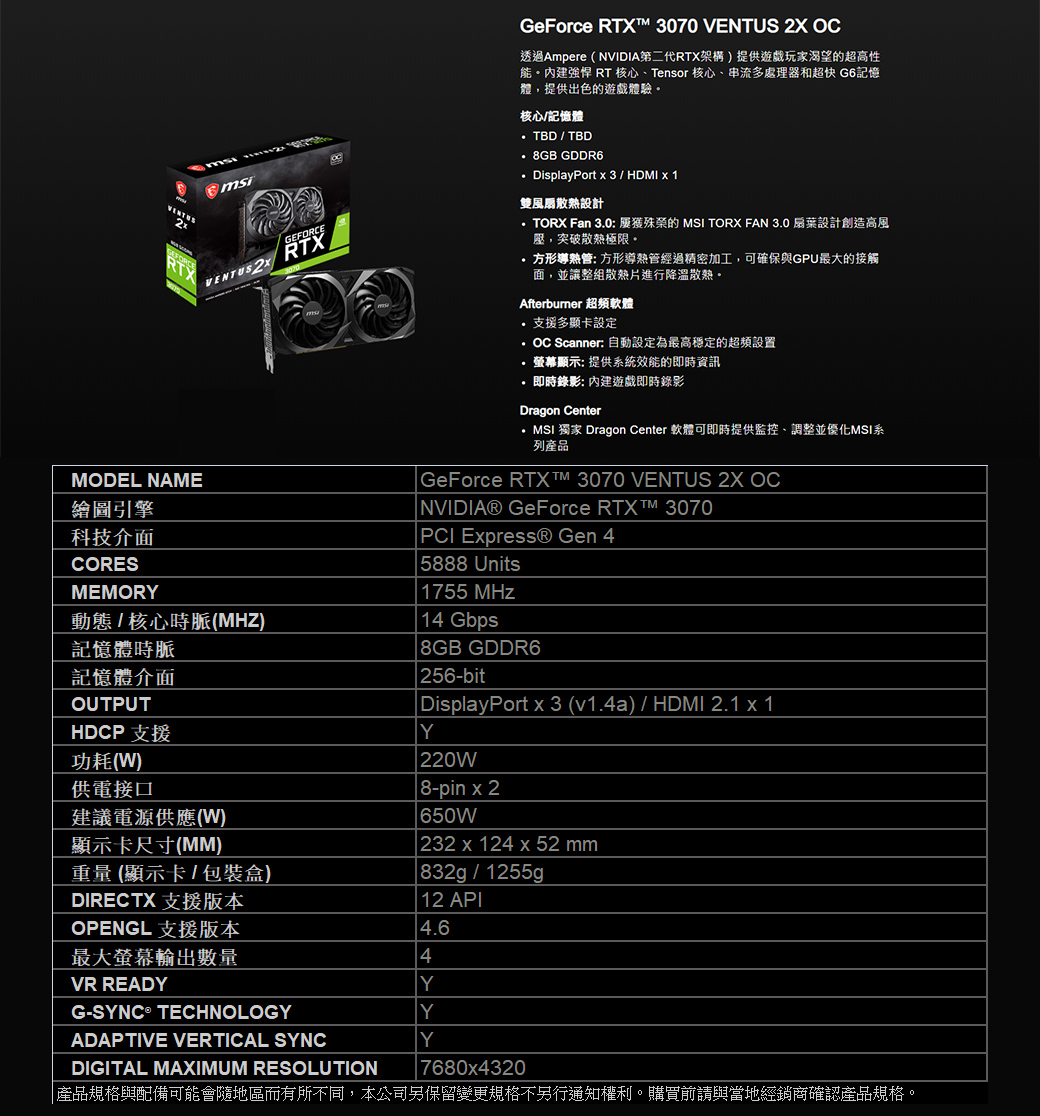 【單買價需搭配850W以上電源供應器】微星 RTX3070 VENTUS 2X OC(1755MHz/23.2cm/雙風扇/註四年)