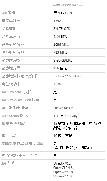 AMD Radeon Pro WX5100 (8GB GD5 256bit/SP:1792/4螢幕輸出/三年保)無附轉線