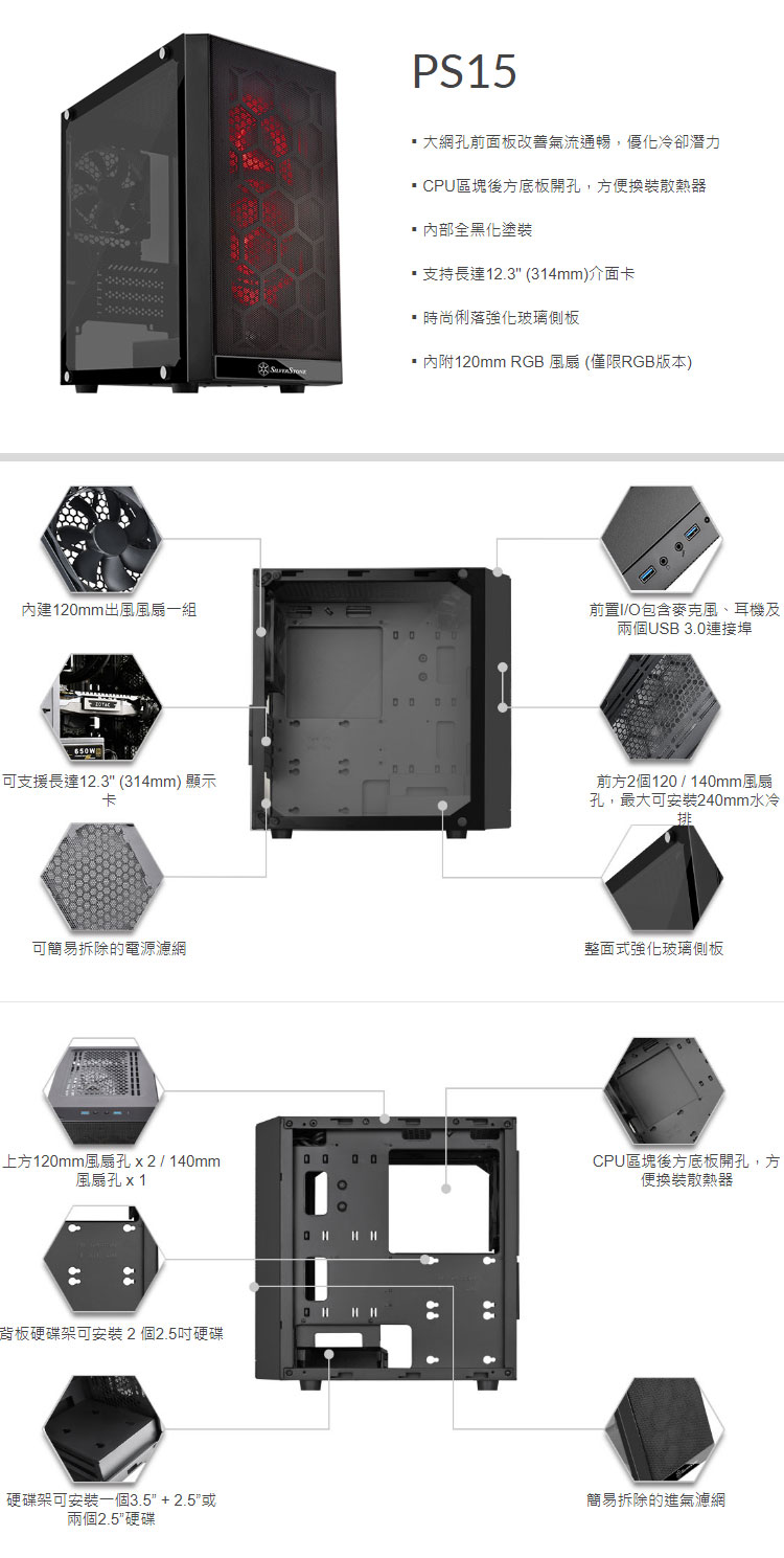 銀欣 PS15 黑 玻璃透側版 顯卡長31.4/CPU高15.4/前12cm*2RGB風扇 後12cm*1 風扇/M-ATX(SST-PS15B-RGB)