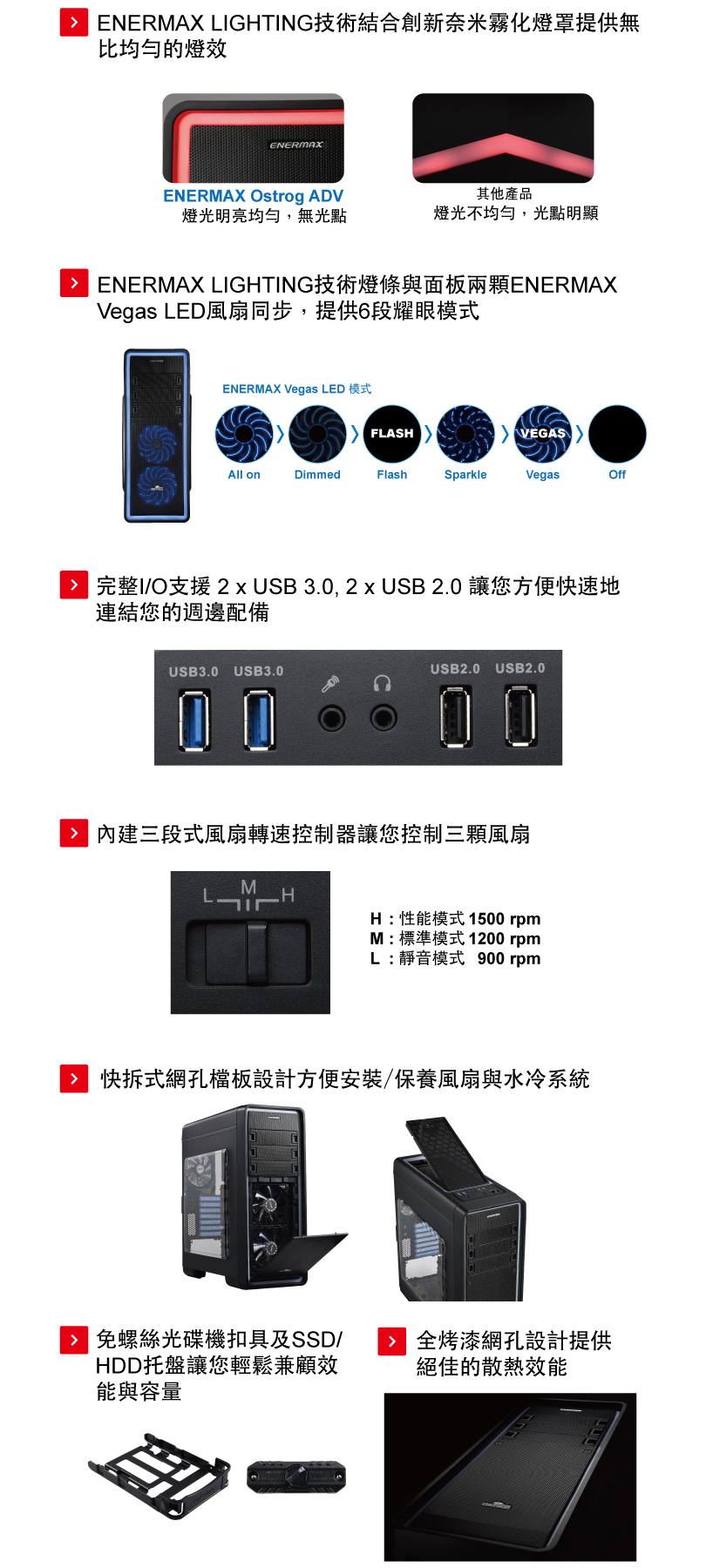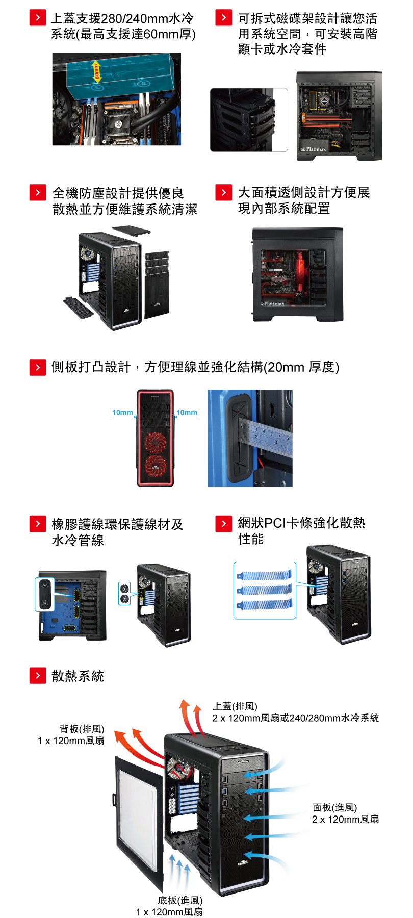 | 散熱風扇 | 前 2x 12CM(LED風扇), 後1x12CM,最高支援六組散熱風扇 |