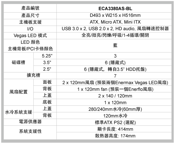 Enermax 保銳 黑魅極光 ECA3380AS-BL(海洋藍) 電腦機殼