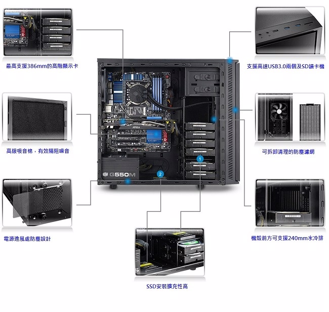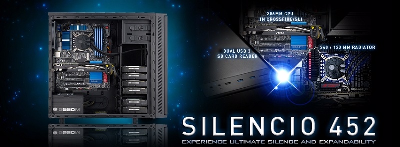 Cooler Master Silencio 452 靜音機殼,典雅的前門面板設計,素雅的機身,與客廳、書房搭配更能彰顯品味。規格上,無論前門與側板採用高級吸音材料做為內襯。預先安裝兩顆高效能風扇於前方及後方,提供最佳的氣流循環。機殼前方可安裝 240mm 水冷排,後方可安裝 120mm 水冷排,符合專業玩家需求。配有兩組高速 USB 3.0 及 SD 讀卡機可充實與行動週邊的連結性。空間上,可安裝高 158mm的CPU 散熱器,支援長達386mm的高階顯示卡。架構上,擁有高度擴充性,支援 2 顆 SSD 及 6 顆傳統硬碟。內建多組可拆式防塵濾網提供最便利的系統維護。Silencio 452 靜音首選。